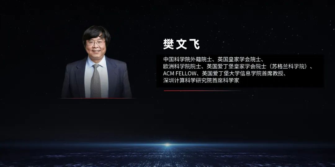 开幕式的首场演讲是由樊文飞院士带来的《大数据:挑战和机遇》。樊院士是中国科学院外籍院士、英国皇家学会院士、欧洲科学院院士、英国爱丁堡皇家学会院士(苏格兰科学院)、ACM Fellow、英国爱丁堡大学信息学院首席教授、深圳计算科学研究院首席科学家,也是英国皇家学会信息技术领域唯一华裔院士,长期从事大数据、数据库理论和系统的研究,建树颇丰。