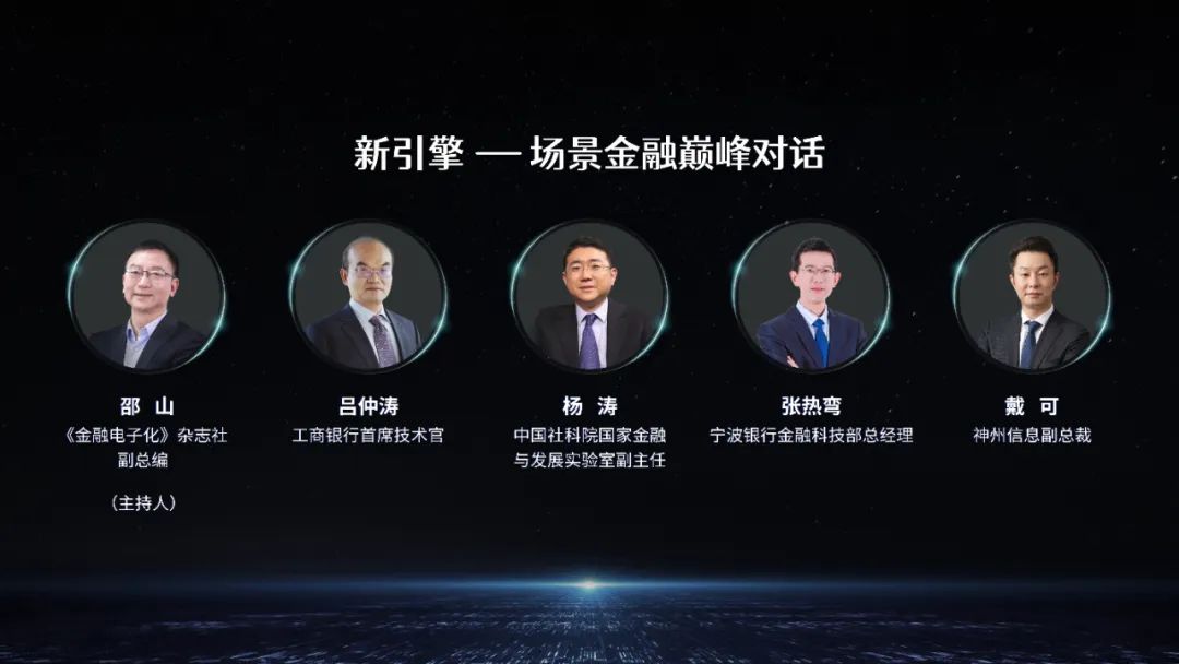 5月27日,由《金融电子化》杂志社、神州信息联合举办的2022TECH第四届数字中国技术年会——“新引擎·场景金融”巅峰对话云上召开。会议邀请了中国工商银行首席技术官吕仲涛,中国社科院国家金融与发展实验室副主任杨涛,宁波银行金融科技部总经理张热弯,《金融电子化》杂志社副总编邵山,深圳计算科学研究院CTO马海寅,神州信息副总裁、新动力金融科技研究院院长于宏志,神州信息副总裁、金融研究院院长戴可多位产学研大咖云上相聚。在神州信息金融研究院副总经理彭众阳主持下,聚焦探讨如何以金融科技为驱动,以数据为核心,通过场景融合创新带来对金融服务模式的颠覆,构建金融新引擎。