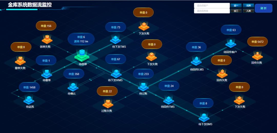 监控管理有很多层面要顾及。要有最基础的服务器、网络资源使用情况的监控和自动报警;也要有业务层面的监控,比如来自于我们大数据系统KingKooData自动发送的业务各项指标的完成报告【图1】、业务数据流的流转阻塞监控【图2】;还要有全国各仓的实时画面监控【图3】。