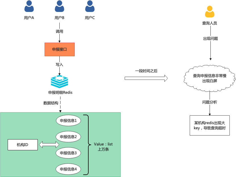 在申报接口的时候系统通过Redis做了一个级存,记录机构的申报信息,Redis数据结构:key=机构、IDvalue=申报列表,而Redis查询发现多了许多大key,体现在一个机构ID一天有上万甚至几十万的申报信息。我们通常将此类问题称为Redis大Key问题。